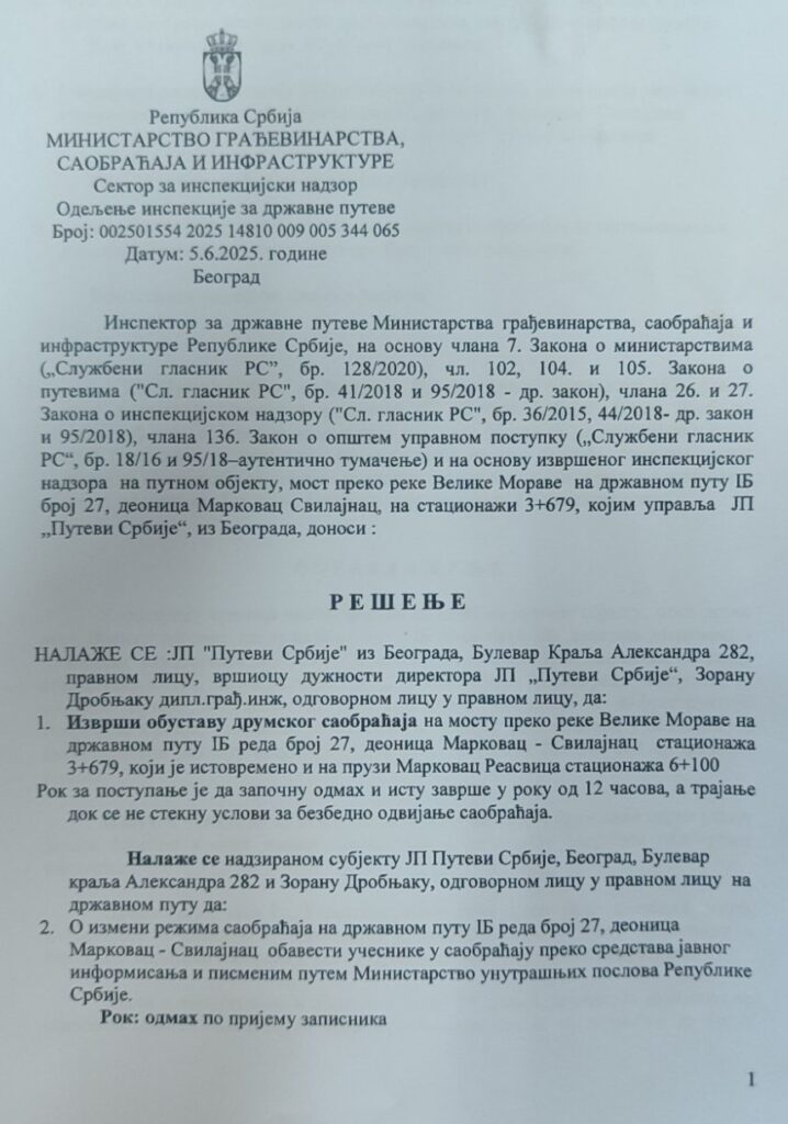 Преносимо и фамозно Решење инспектората за државне путеве Министарства грађевинарства, саобраћаја и инфратруктуре Републике Србије од 05. јуна 2025-е године којим је наложено да се обустави саобраћај на мосту Велике Мораве. У овом Решењу нема ни речи о новом мосту као ни о заобилазници.