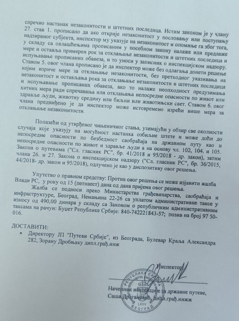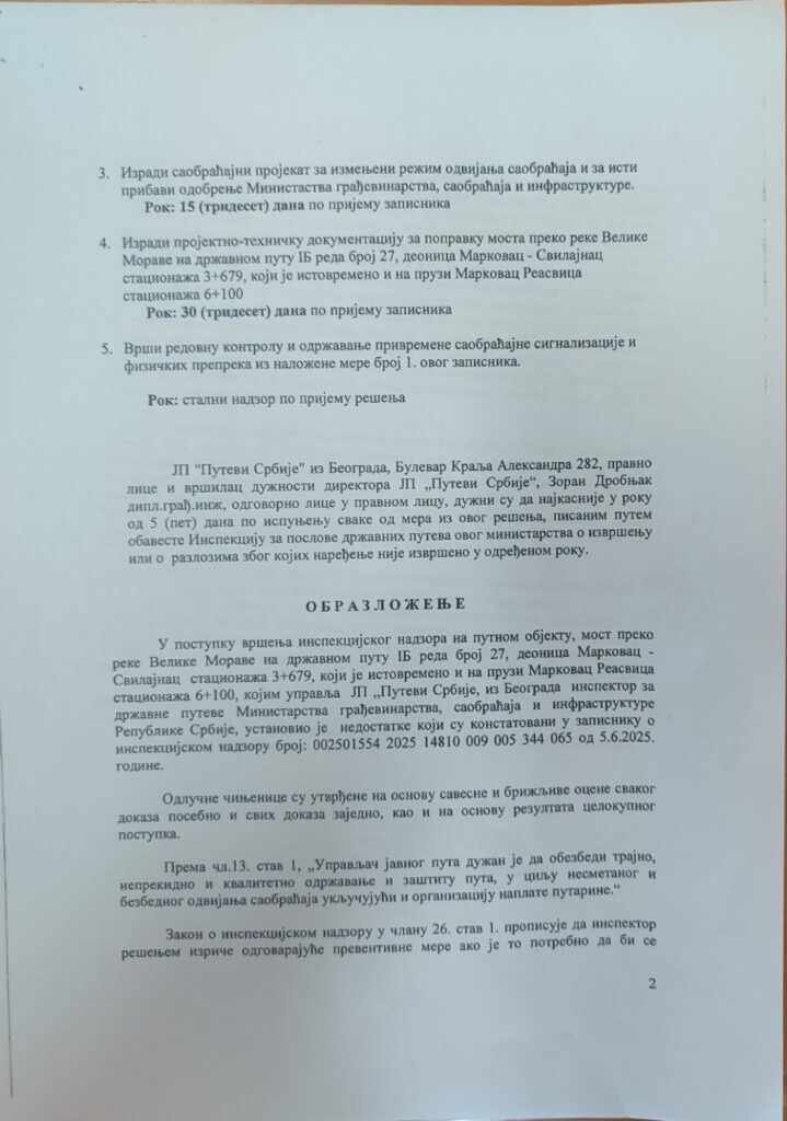 “Инспектор за државне путеве Министарства ргађевинарства, инфраструктура и саобраћаја републике Србије, установио је недостатке који су констатовани у записнику о инспекцисјком надзору број 002501554 2025 14810 009 005 344 065 од 05.06.2025”