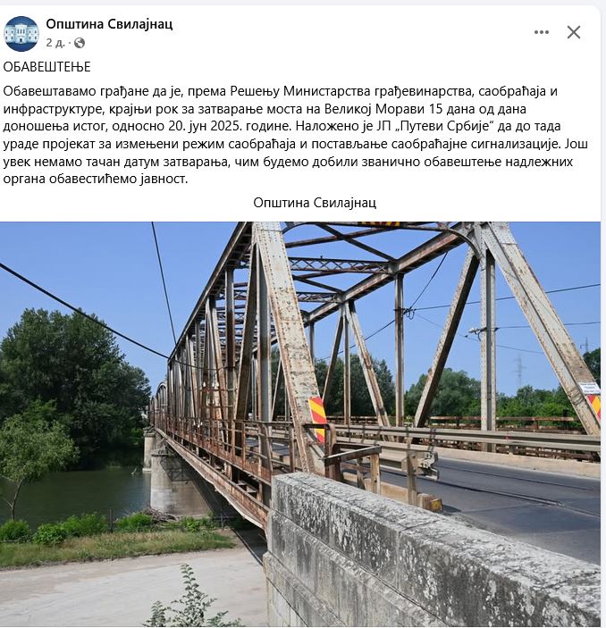 Зашто општина Свилајнац својом објавом на фејсбук профилу обавештава грађане да је “крајњи рок за затварање моста на Великој морави 15 дана од дана доношења истог, односно 20. јун 2025” када у Решењу Инспекције Министарства пише: